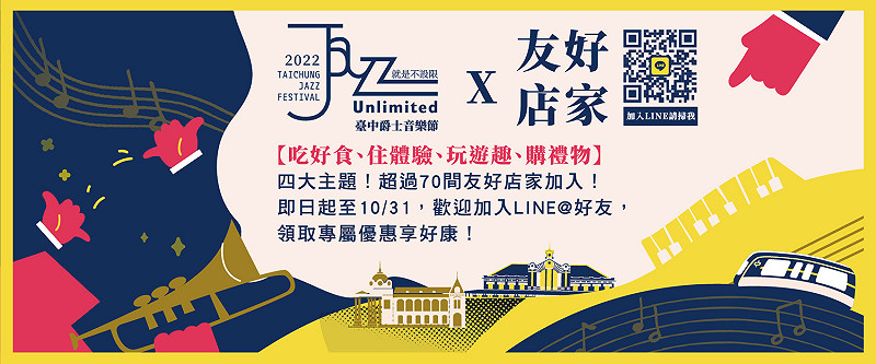 此外,近年台中爵士音樂節積極透過友好店家的招募,與地方產業和知名品牌的合作,創造屬於爵士音樂的龐大商機。今年共招募到75家不同類型的業者,並與旅幸福集團、和泰汽車、福爾摩沙草悟道酒店、momo購物網、台中YouBike、台中大毅老爺行旅等企業合作,活動期間參與民眾只要加入台中爵士音樂節官方Line好友,就能享受各式各樣專屬優惠。